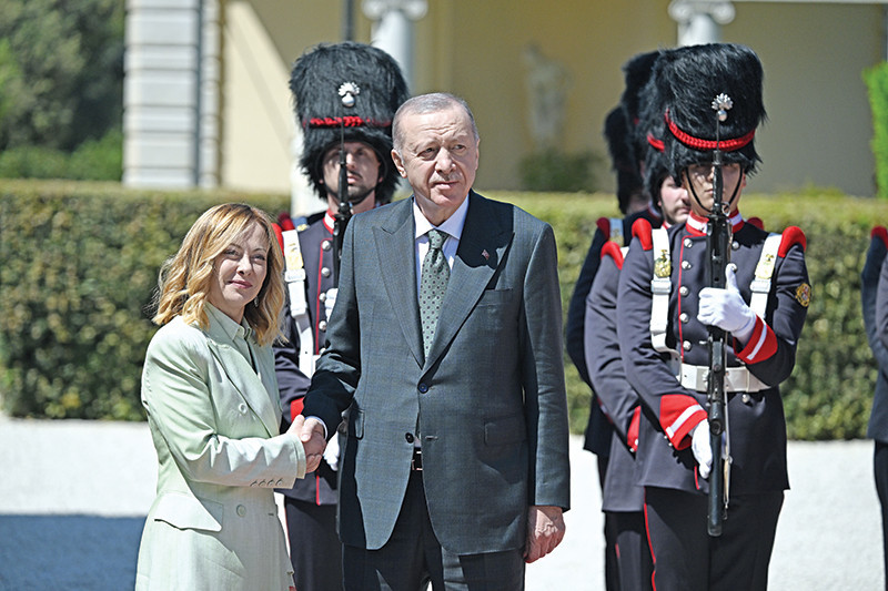 Erdoğan’ı Fiumicino Leonardo da Vinci Milletlerarası Havalimanı’nda, Türkiye’nin Roma Büyükelçisi Elif Çomoğlu Ülgen ve beraberindeki elçilik heyeti karşıladı. Daha sonra Villa Pamphili Konutu’na geçen Erdoğan’ı İtalya Başbakanı Giorgia Meloni resmi merasimle karşıladı. Erdoğan, Türkiye-İtalya 4. Hükümetlerarası Zirvesi’nin akabinde Meloni ile ortak basın toplantısında açıklama yaptı.