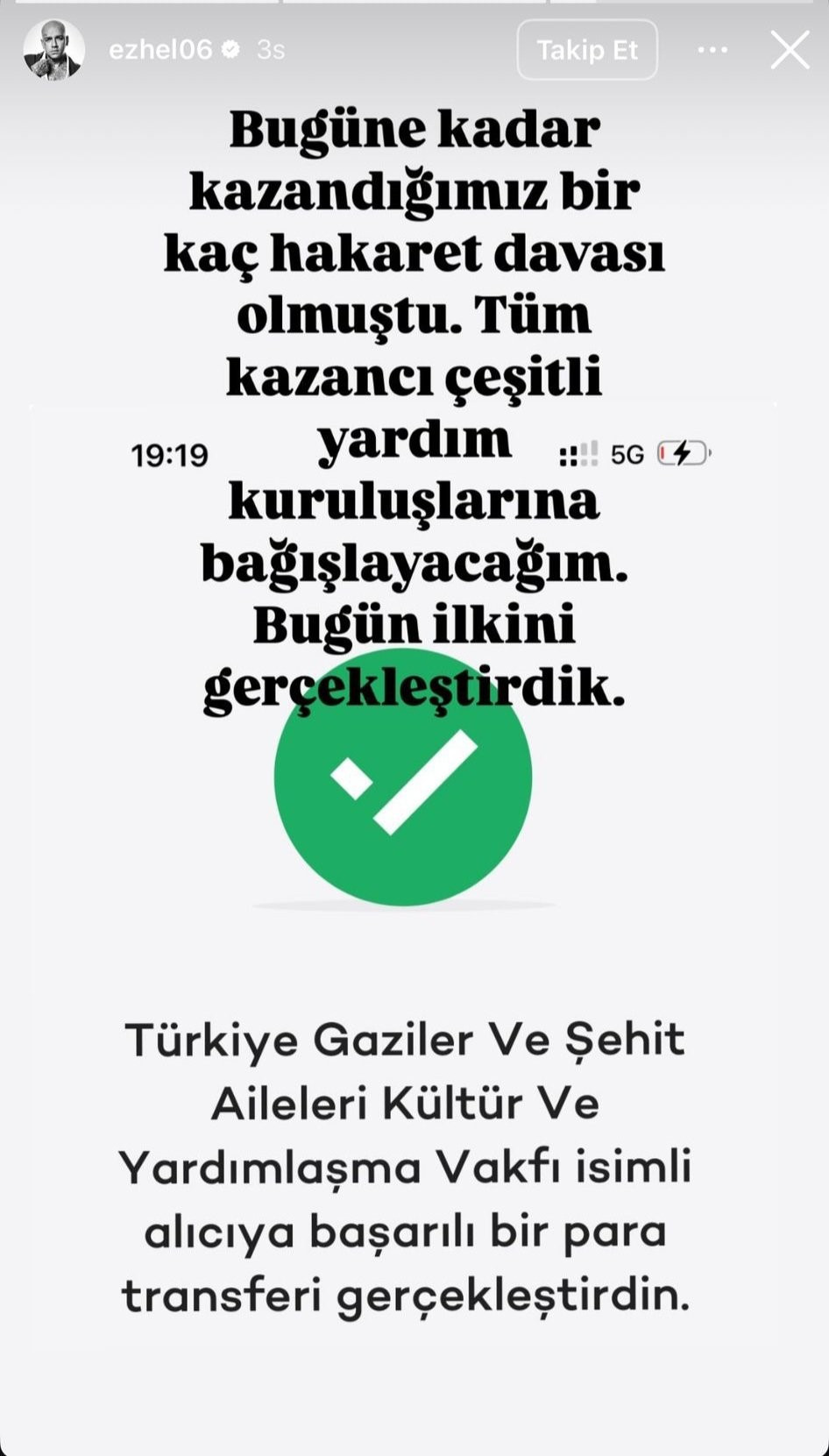 Rap müziğiyle tanınan ve sahne ismi Ezhel olan sanatkarın bir hakaret davasından kazandığı tazminatı Türkiye Gaziler ve Şehit Aileleri Vakfı’na (TÜGŞAV) bağışladığını toplumsal medya hesabı üzerinden duyurmasının akabinde vakıftan açıklama geldi.